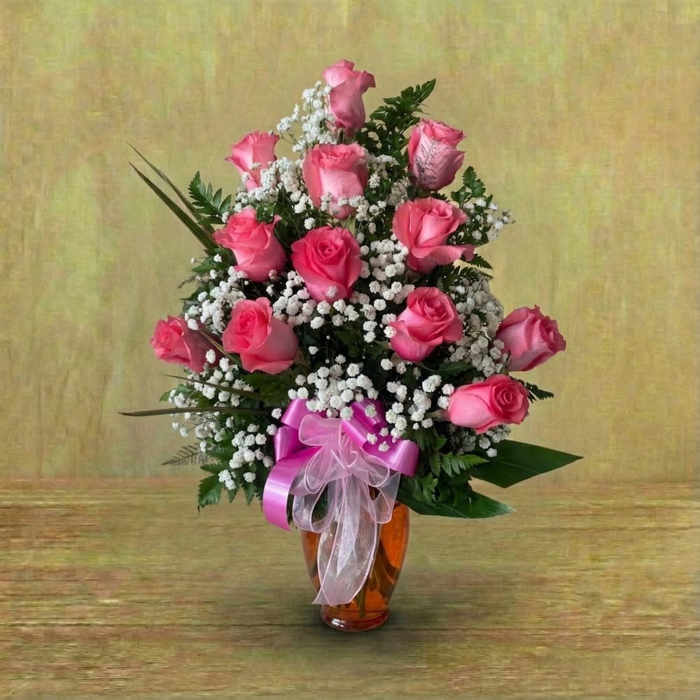 Ilumina su día con este radiante arreglo floral. La combinación de rosas rosadas con el tono cálido de la base crea un diseño lleno de energía positiva y dulzura.
