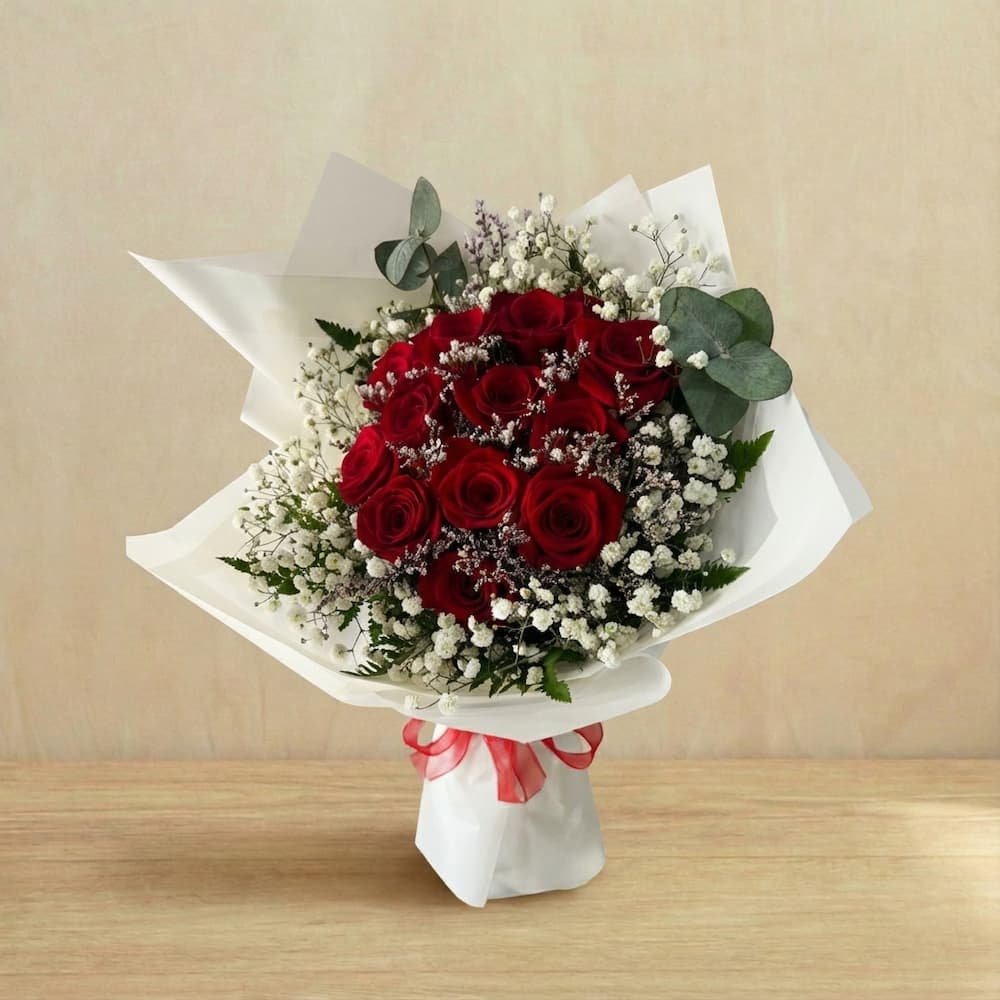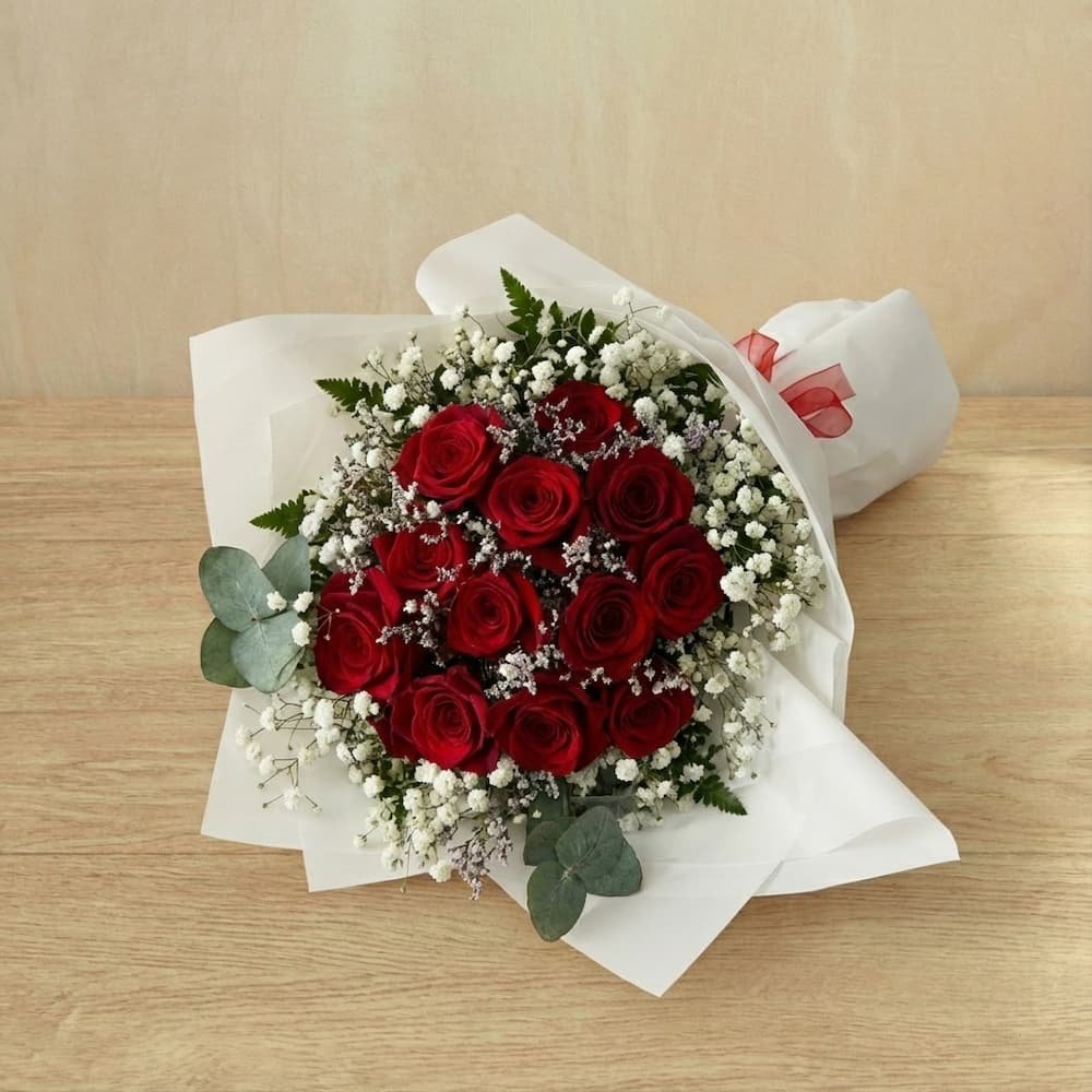 - Flowers: Hand-selected red roses paired with delicate Baby's Breath and eucalyptus