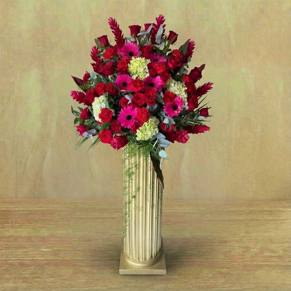 - Nota Importante: El precio incluye el arreglo floral. El pedestal (columna dorada) no está incluido, pero puedes rentarlo por un costo adicional si deseas la presentación completa.