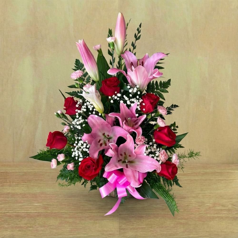 - Flores: Exquisitos Lirios rosados, rosas rojas frescas y toques de mini claveles.