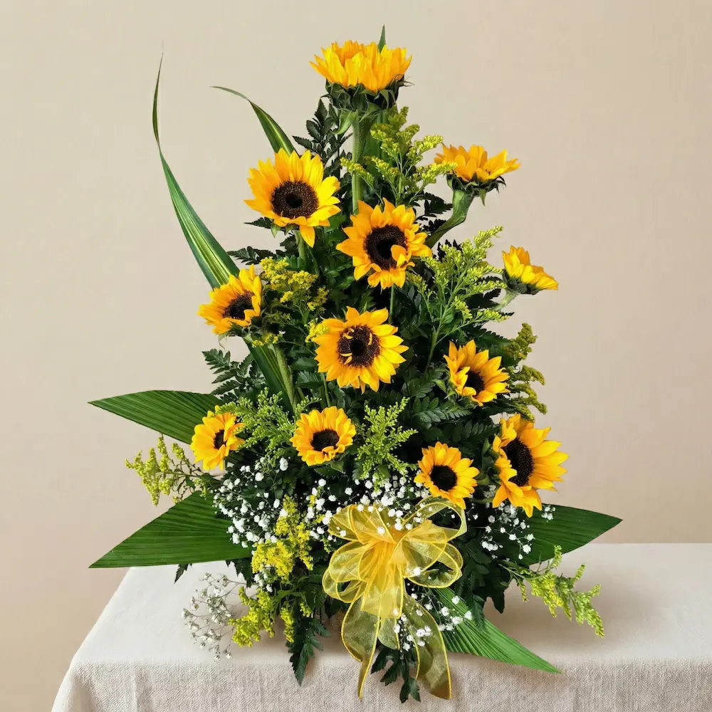 Espectacular arreglo de 12 girasoles con follaje silvestre y elegante lazo amarillo. Un detalle imponente para cumpleaños, graduaciones o aniversarios que llena de luz cualquier espacio en Managua.
